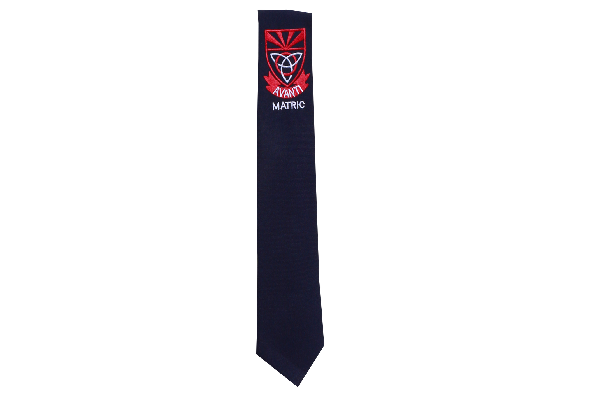 Navy tie with Kenmont emblem and "Matric" embroidered onto it.