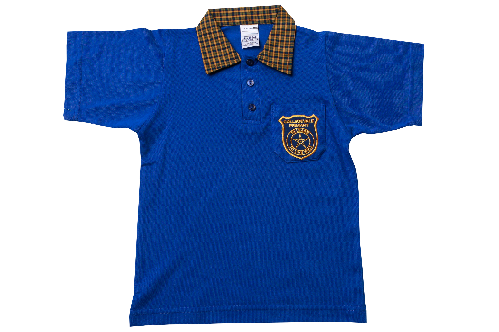 Royal blue short sleeve golf shirt with gold and navy check collar. It has the Collegevale emblem embroidered onto the pocket. To be used by Collegevale boys.