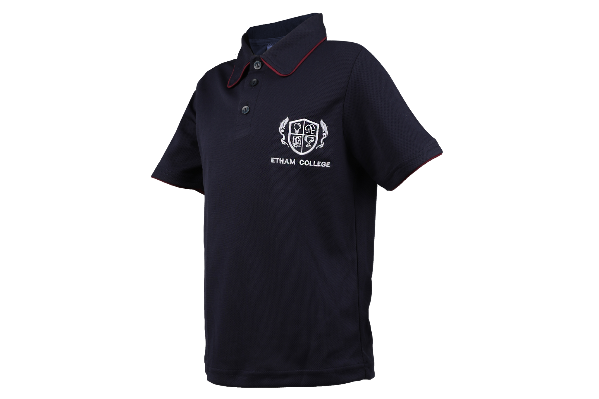Navy short sleeve golf shirt with Etham emblem embroidered onto the golf shirt.