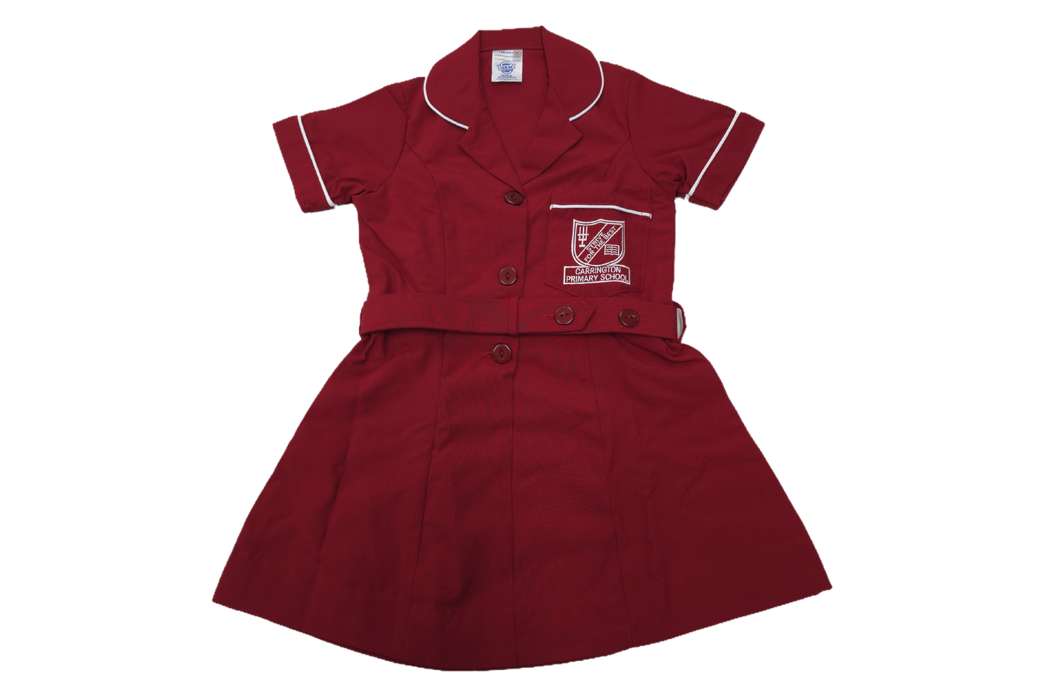 Red dress with white piping and Carrington Primary logo embroidered on pocket