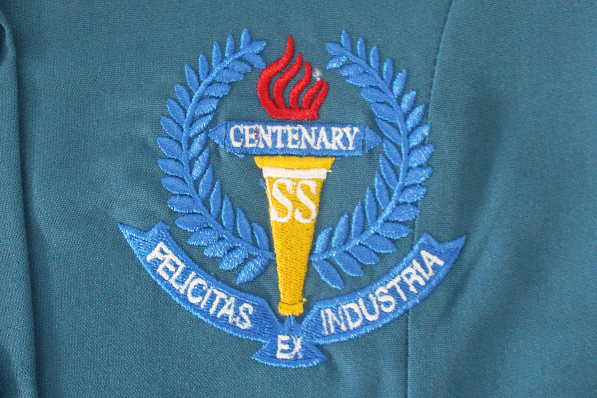 Centenary dress with piping on the collar, cuffs and top pocket. It has Centenary emblem embroidered onto it.