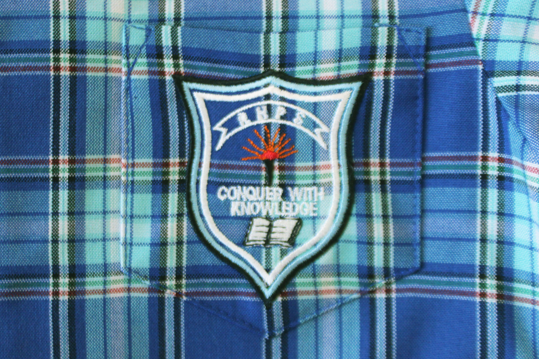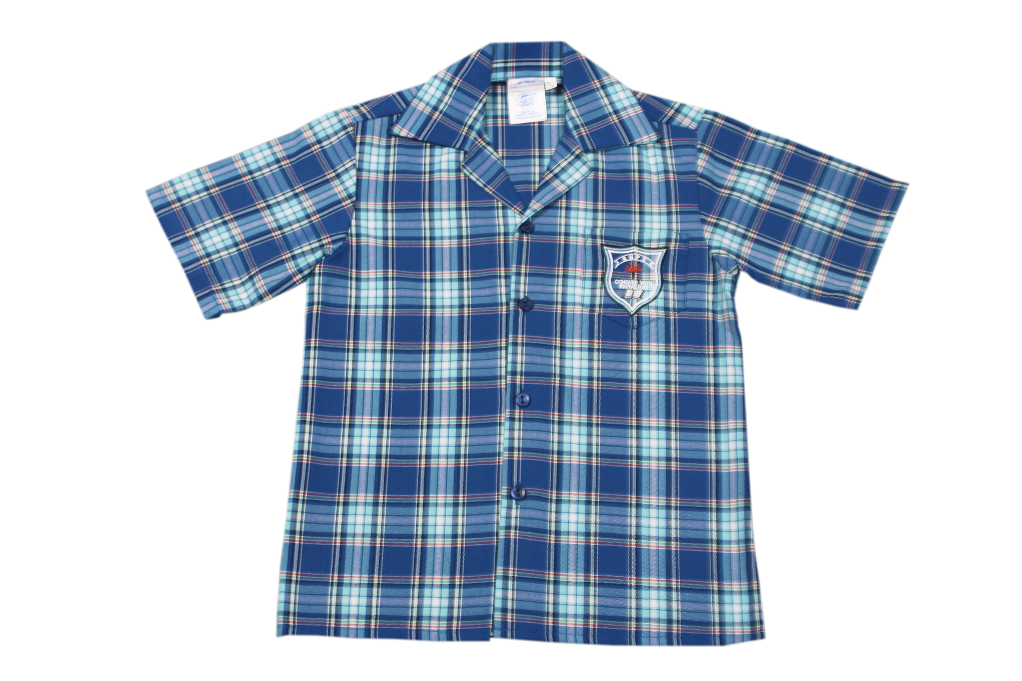 Navy and white check short sleeve shirt. It has the Reservoir Hills Primary School emblem embroidered onto the top pocket.