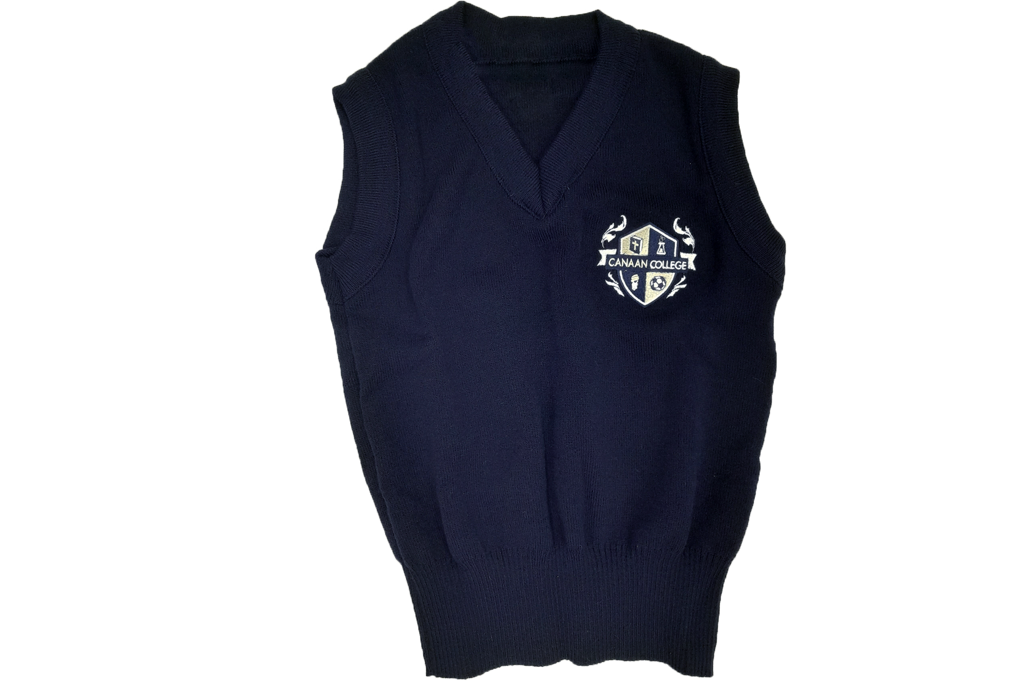 Navy sleeveless jersey with Canaan College emblem embroidered onto it.