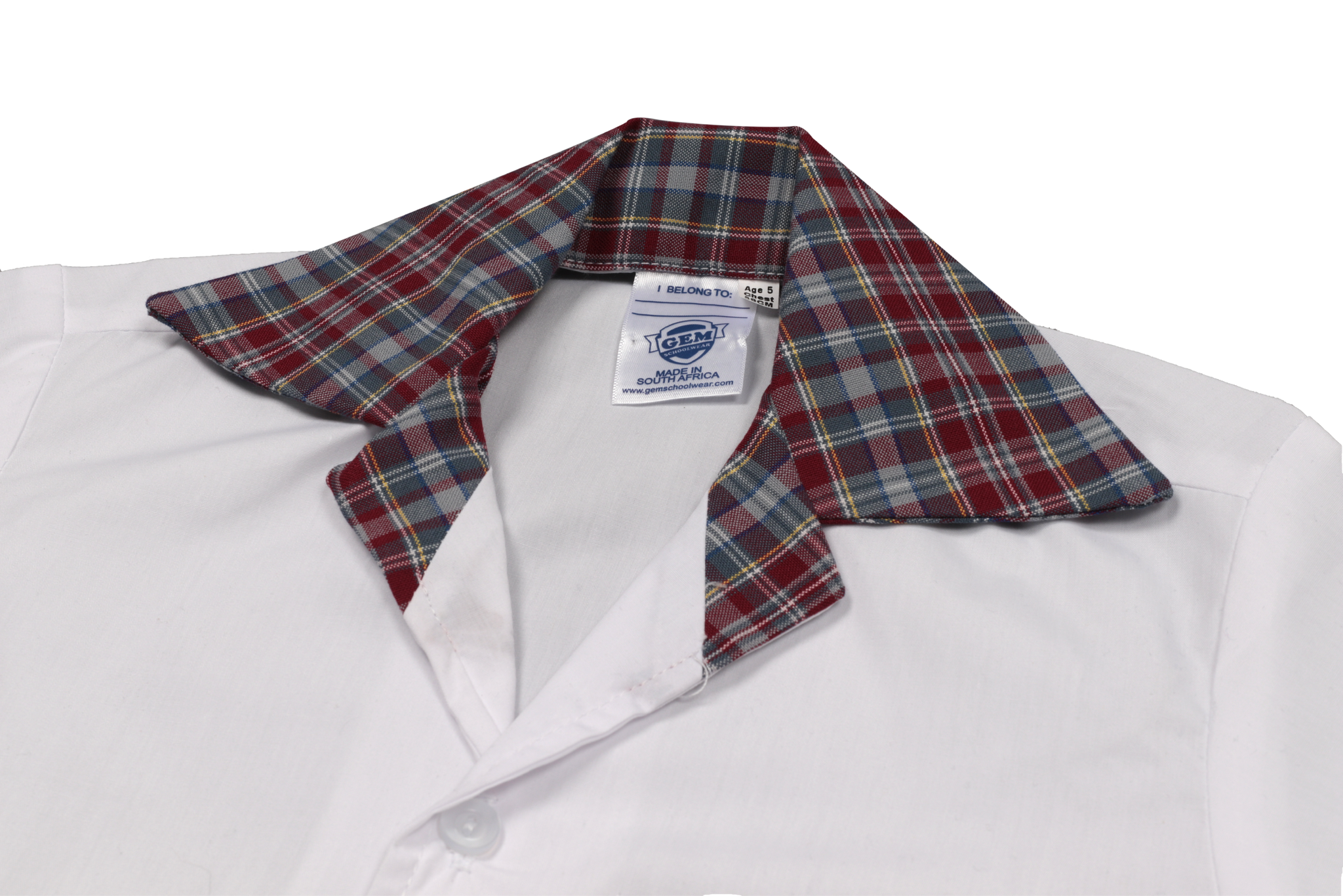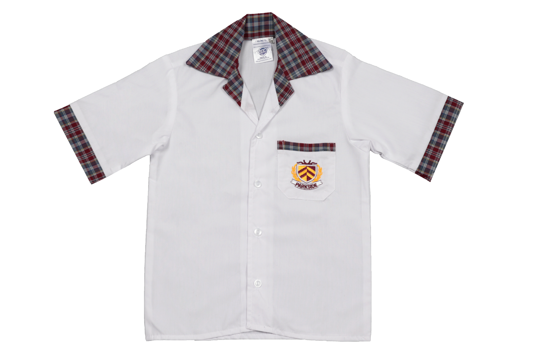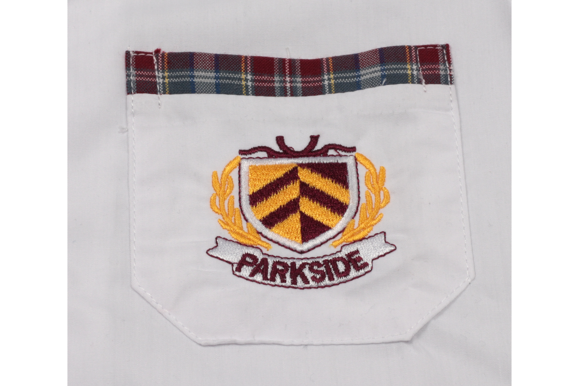 Short sleeve white shirt with a check collar. It has the Parkside embroidered onto it.