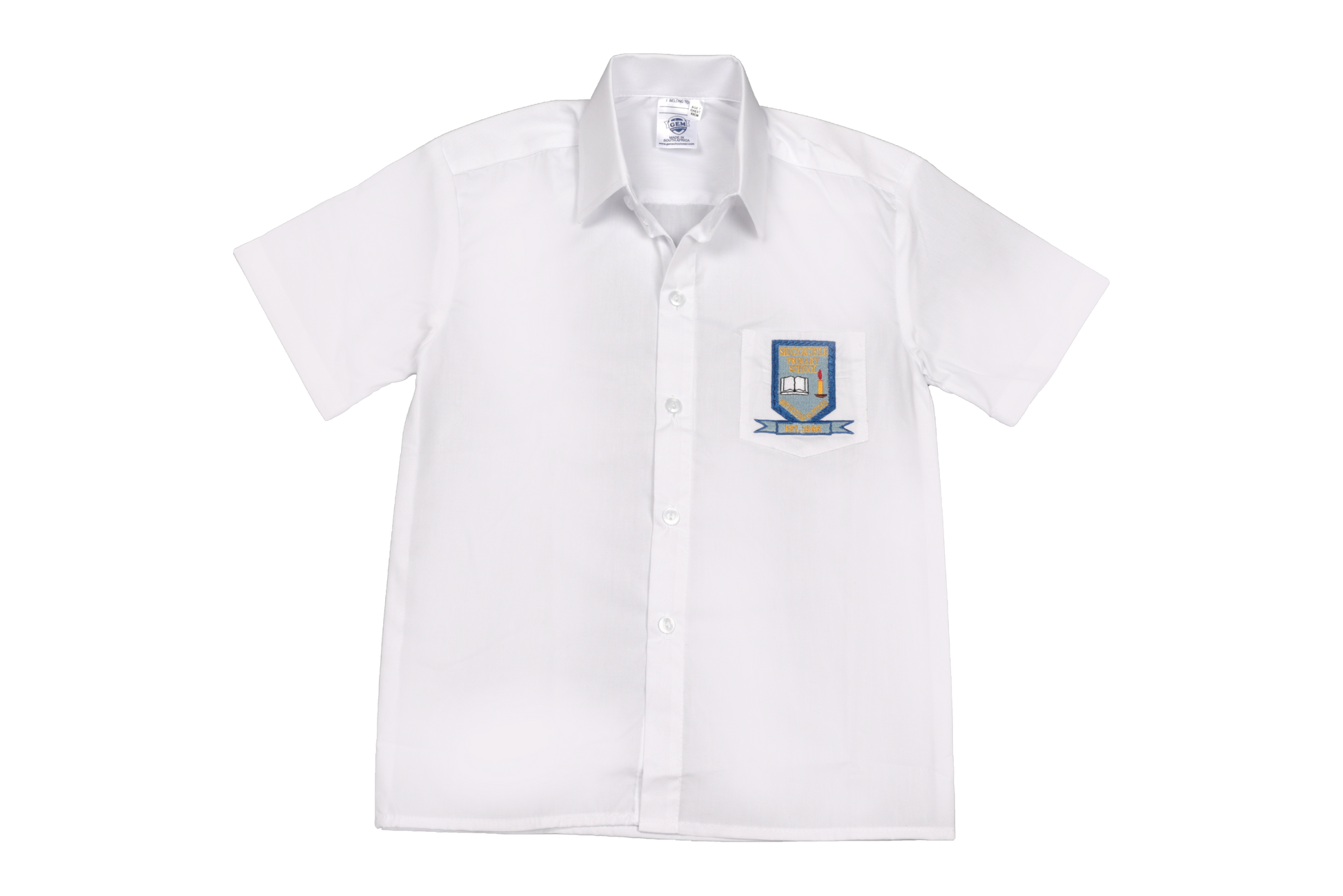 Short sleeve white shirt. It has the Senzokuhle Primary emblem embroidered onto it.