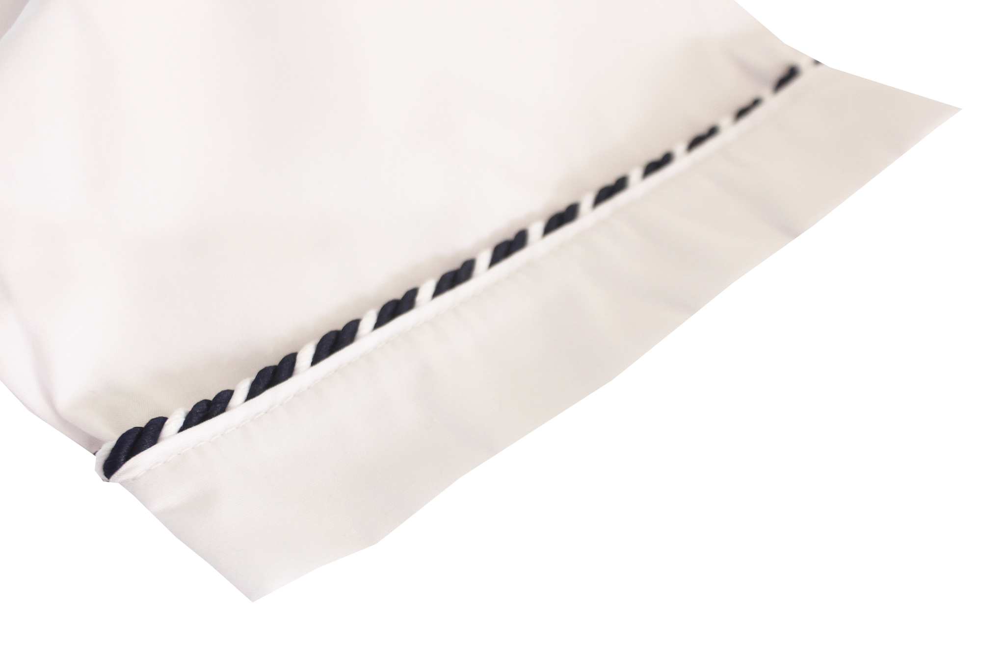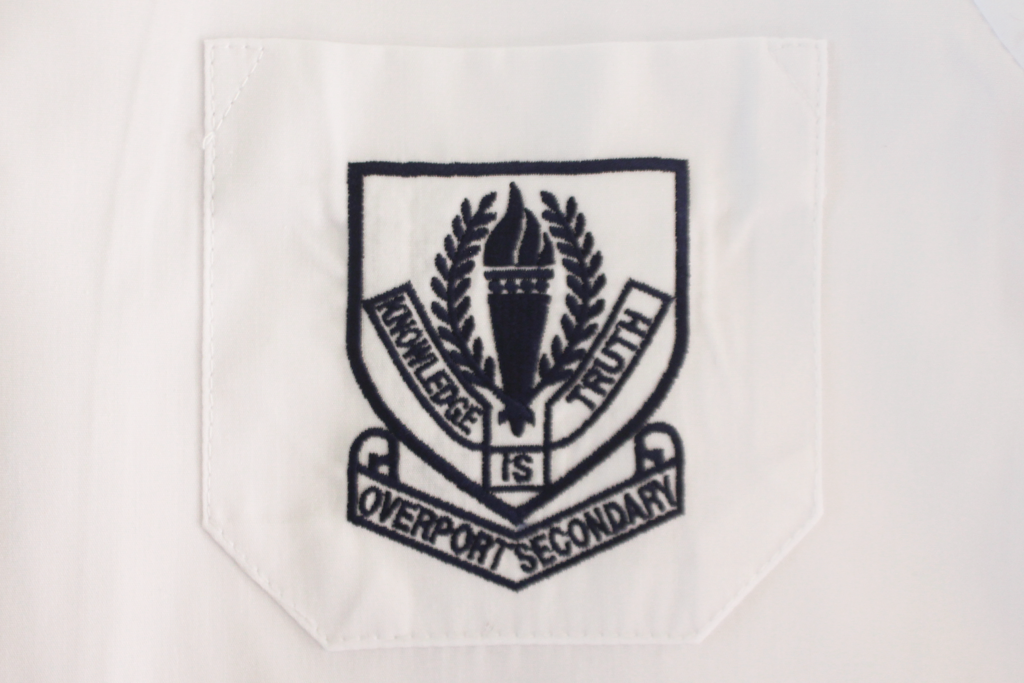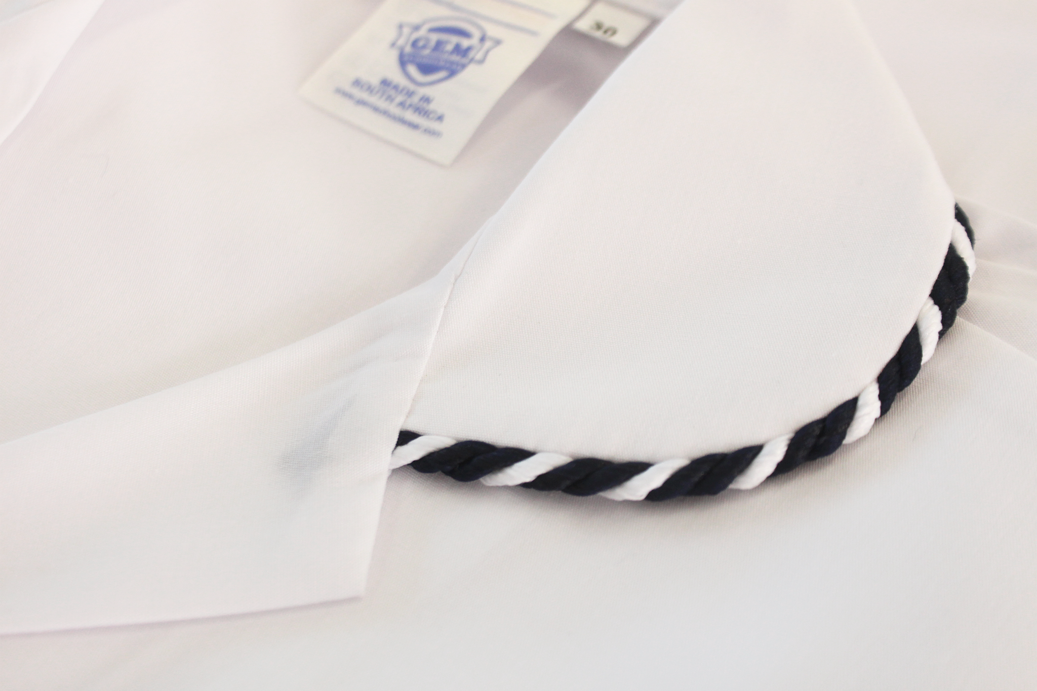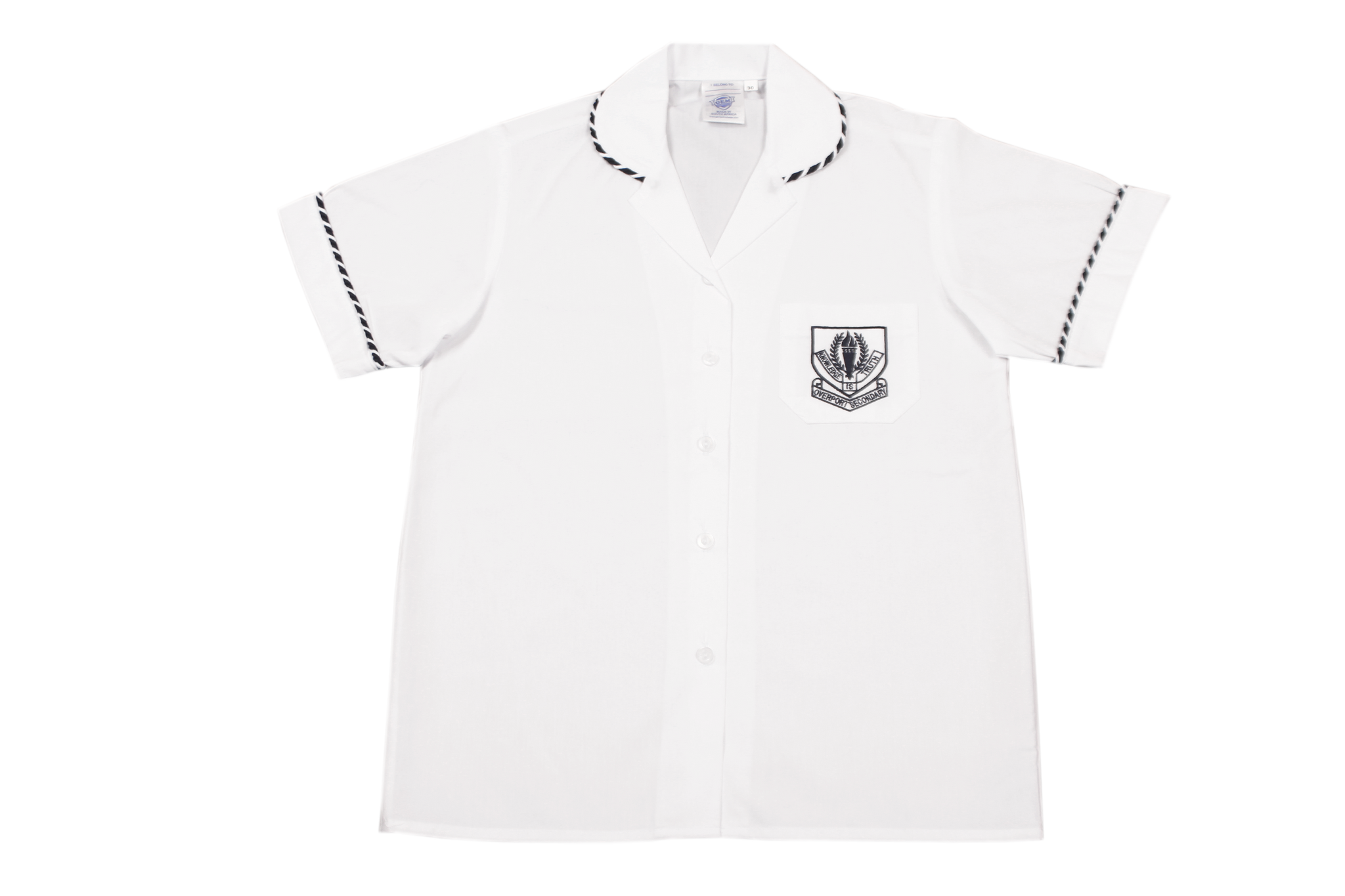 Short sleeve white blouse with a gladneck collar. It has navy and white braiding and the Overport Secondary emblem embroidered onto it.