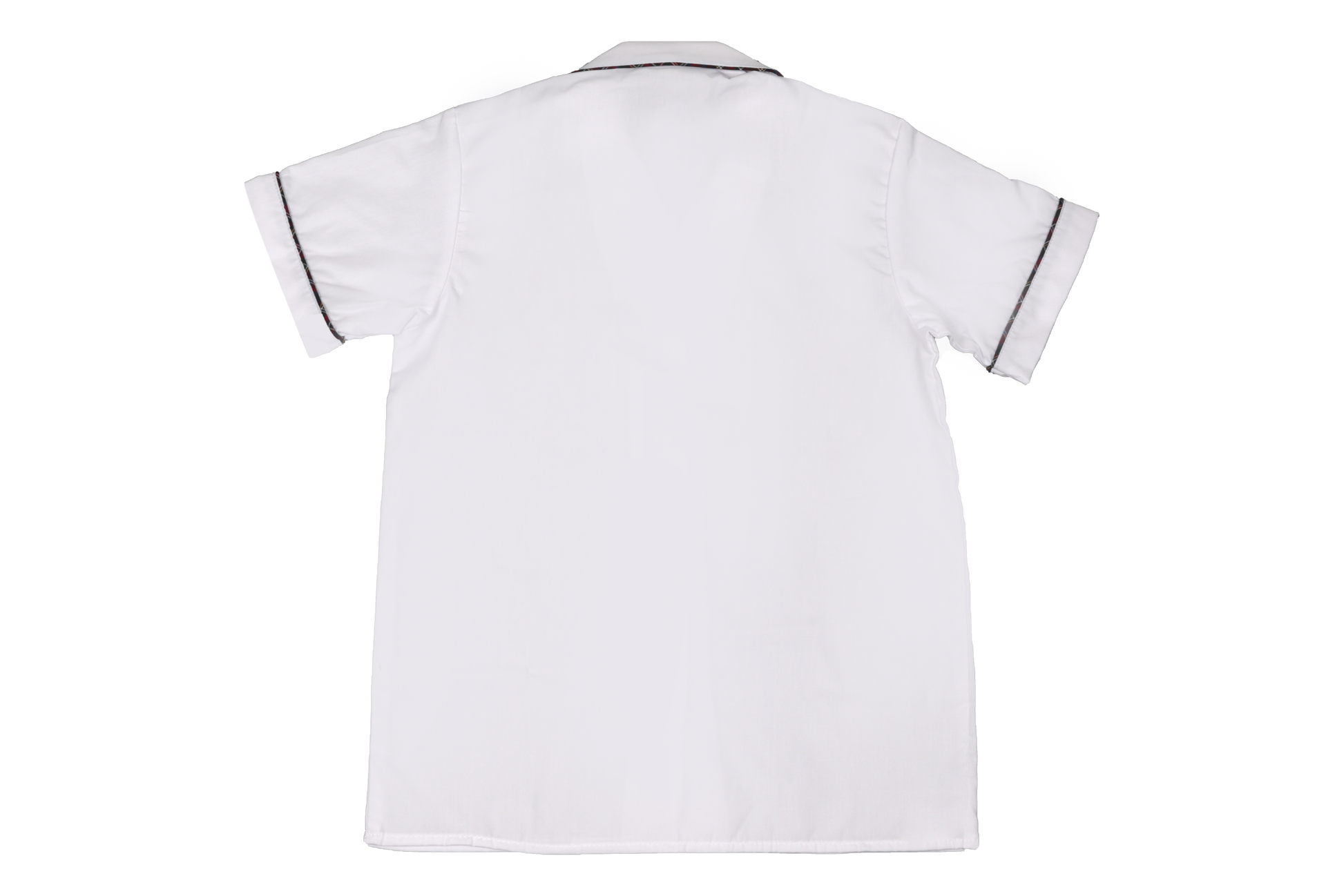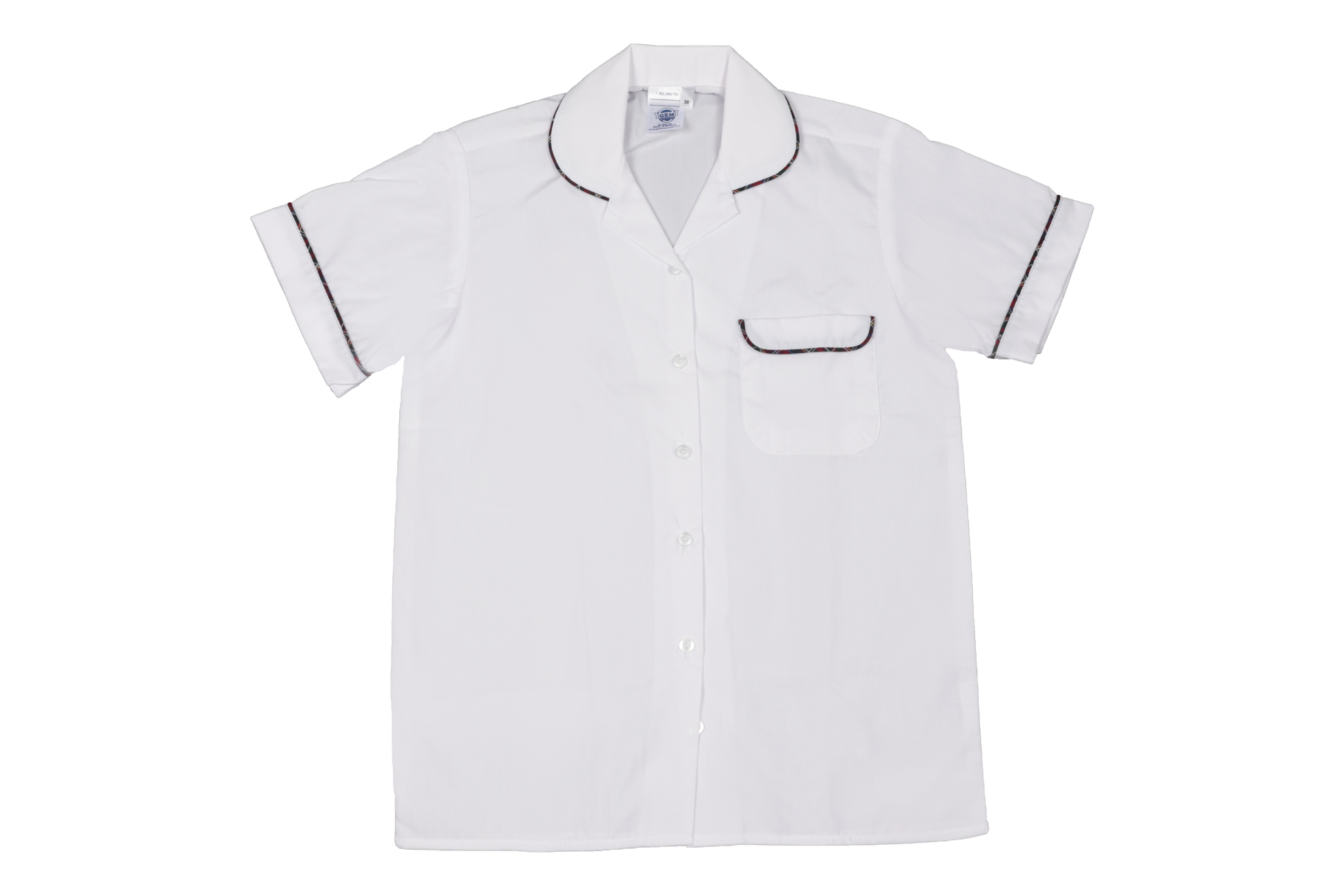 Short sleeve blouse with a roundneck collar with tartan piping on collar, sleeve and pocket