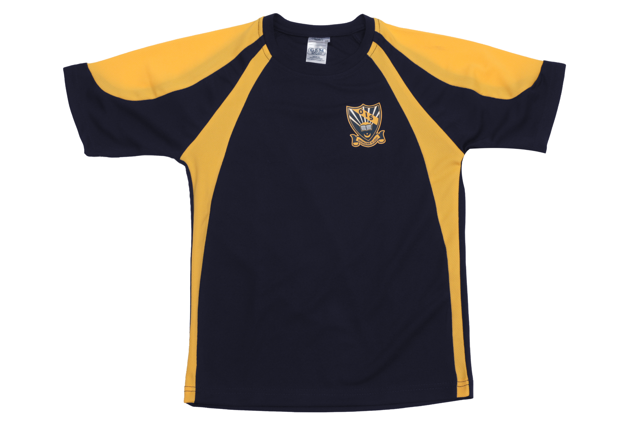 Navy/Yellow short sleeve T-Shirt. It has the Orient emblem printed onto it.