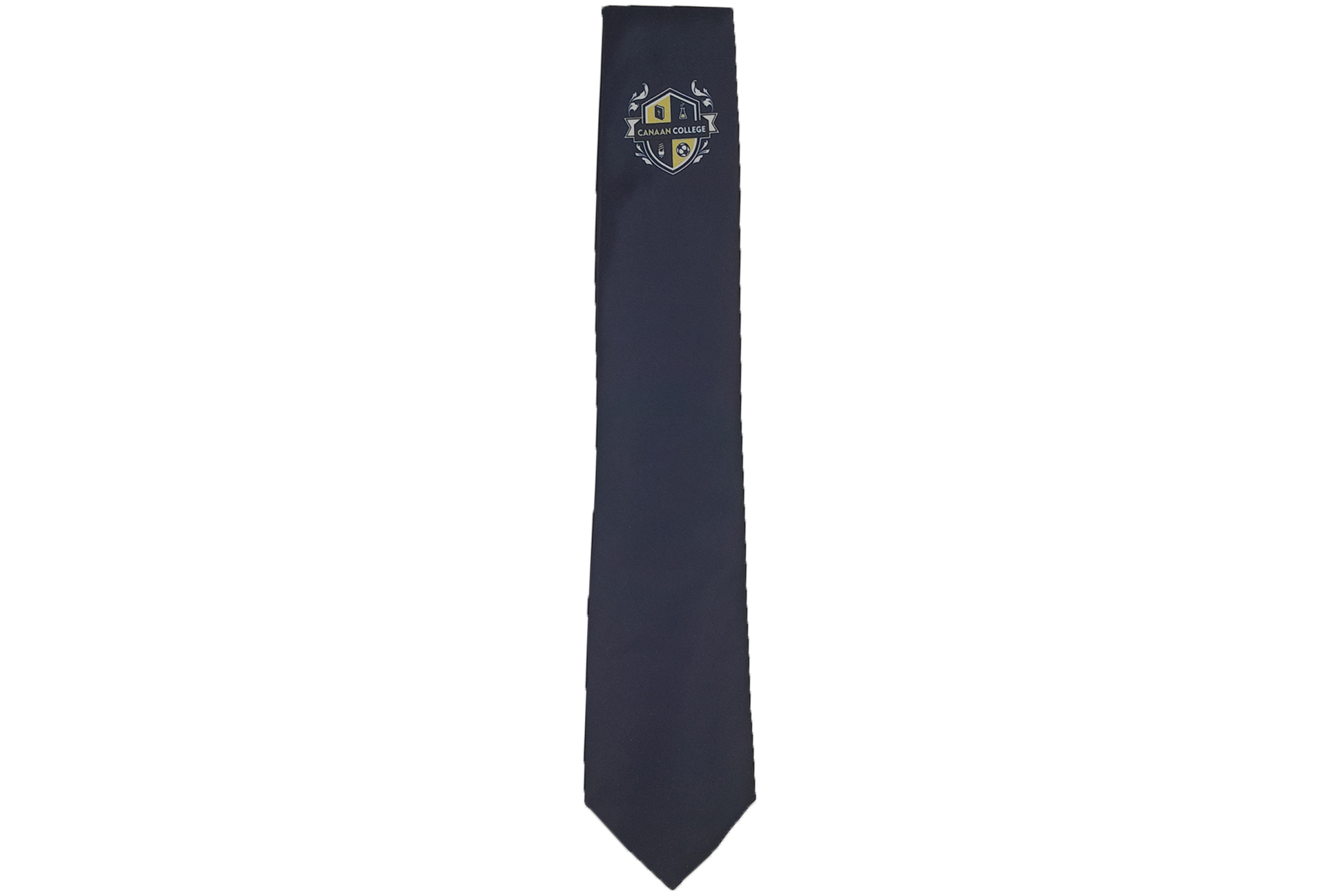 Navy sublimated school tie with the Canaan College logo sublimated onto the tie