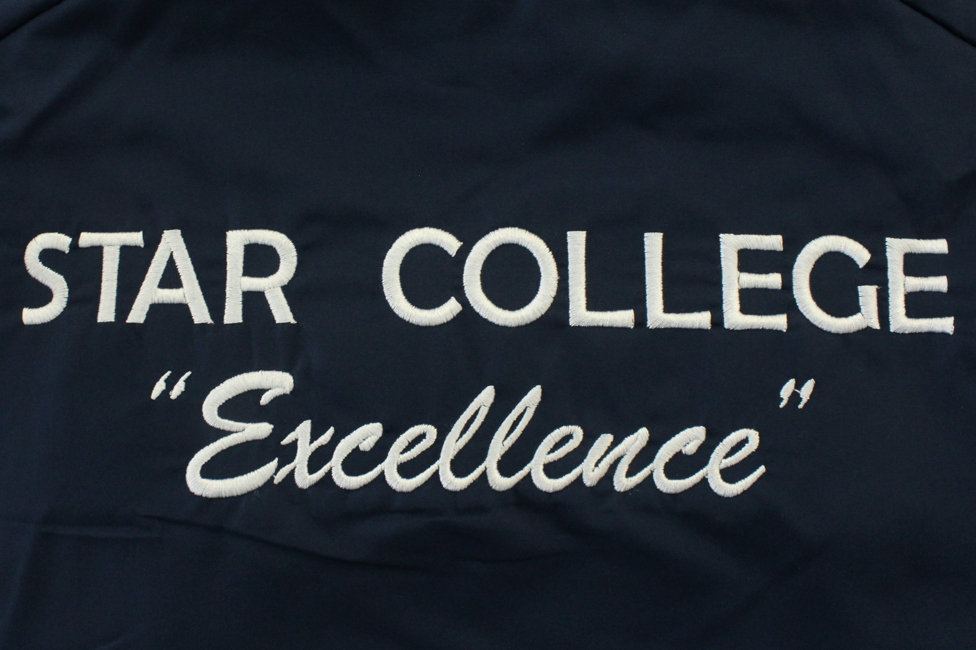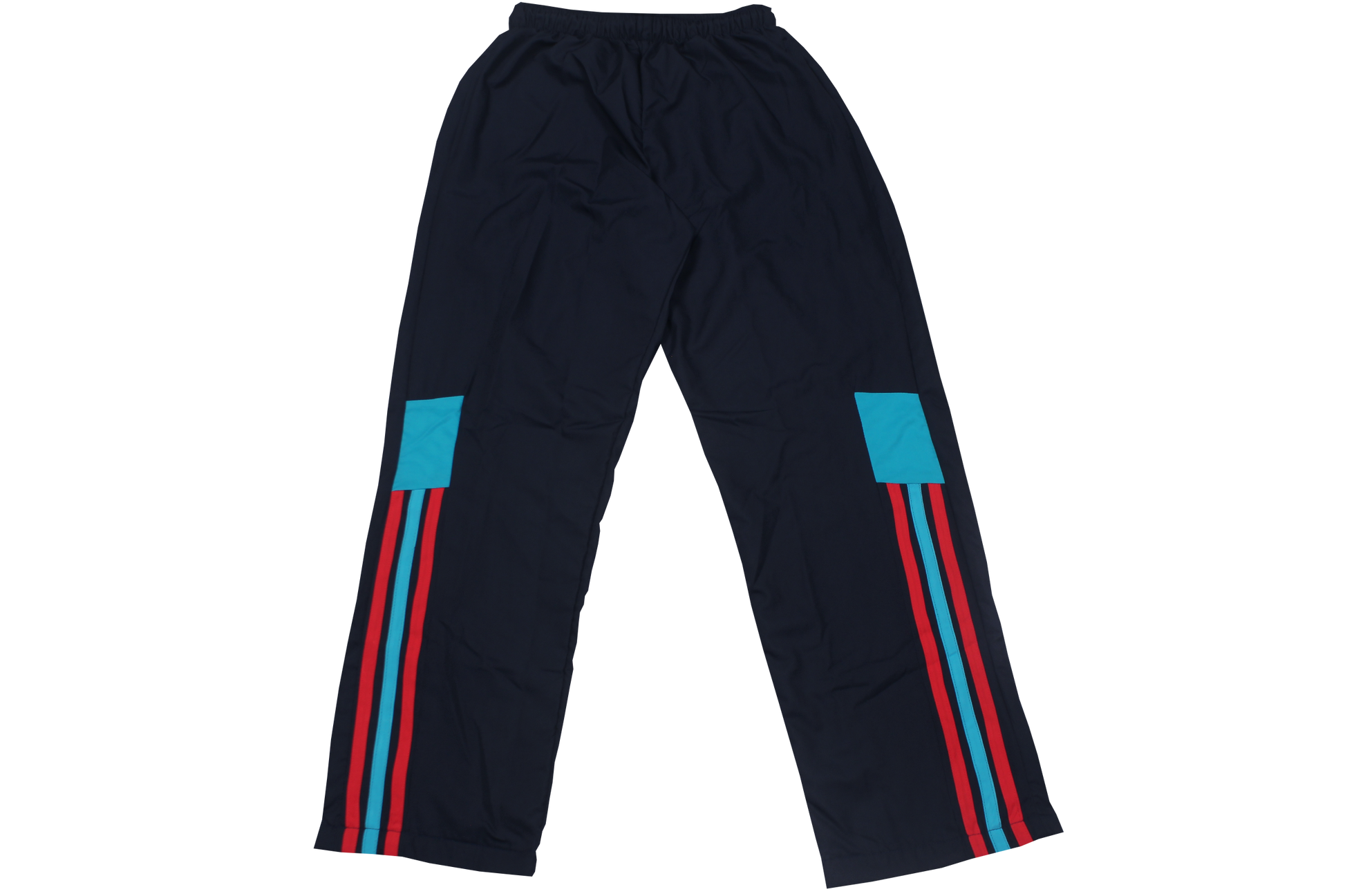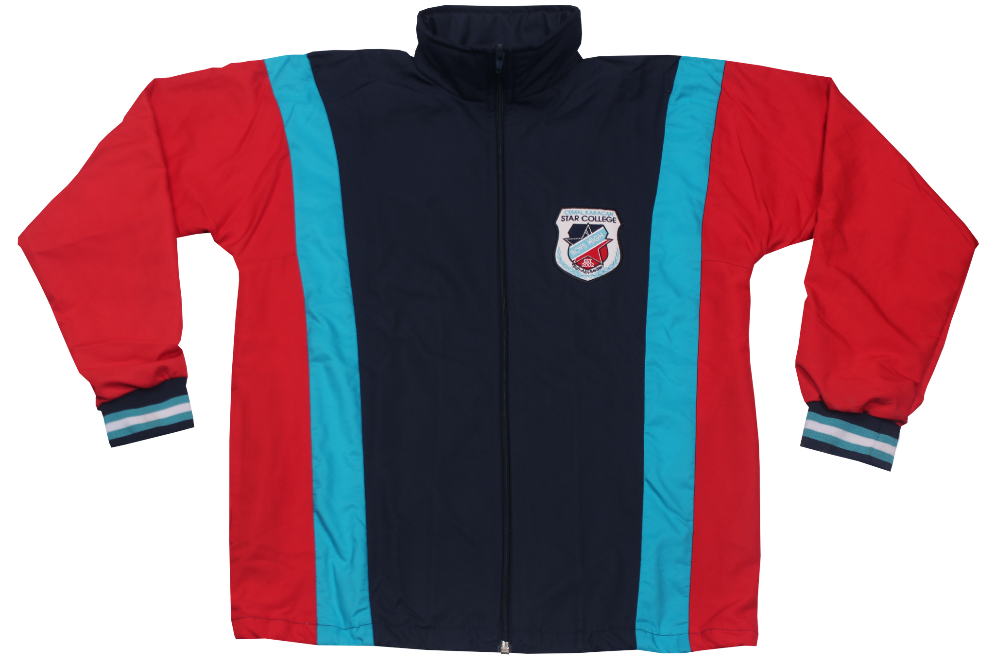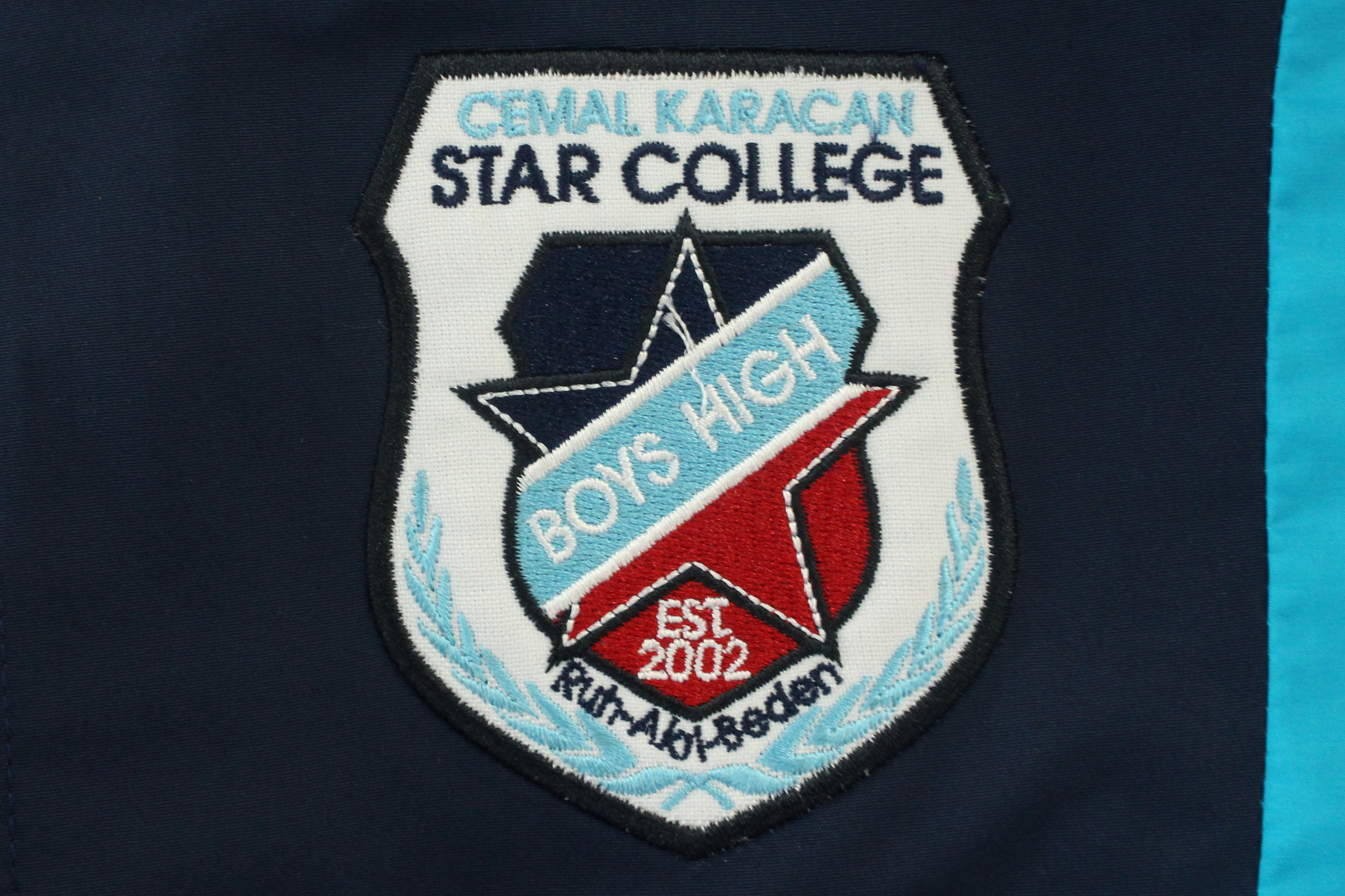 Navy, sky and red tracksuit set with Star Boys High emblem embroidered onto the jacket.